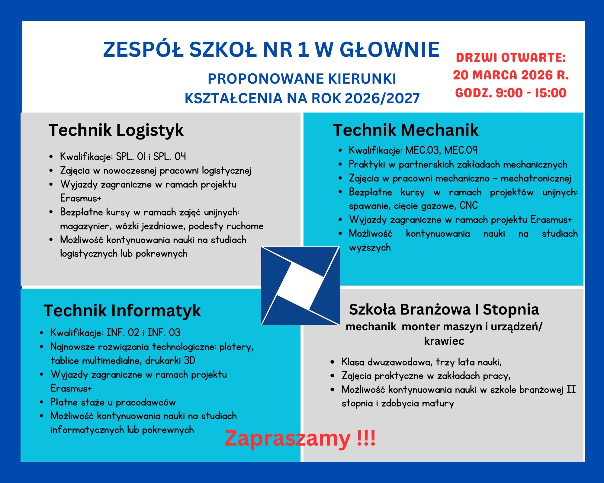 Przyjdź na Dzień Otwarty 20 marca 2026 roku w Zespole Szkół Nr 1 w Głownie i zobacz, jak wygląda nauka od środka. Poznaj kierunki, pracownie, uczniów i nauczycieli. Sprawdź, czy to szkoła dla Ciebie!