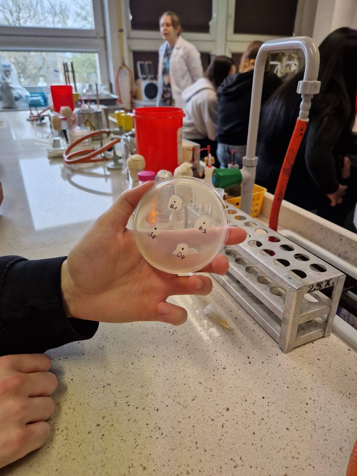 i otoczeniu. Jednym z ciekawszych obserwacji był tzw. „bakteryjny odcisk dłoni” na pożywce czyli pojawienie się kolonii bakterii, co stanowiło wyraźny dowód na obecność mikroorganizmów na skórze. Całość warsztatów rozwijała świadomość mikrobiologiczną, uczyła zasad higieny oraz pokazywała, jak ważną rolę odgrywa niewidzialny mikroświat w życiu człowieka